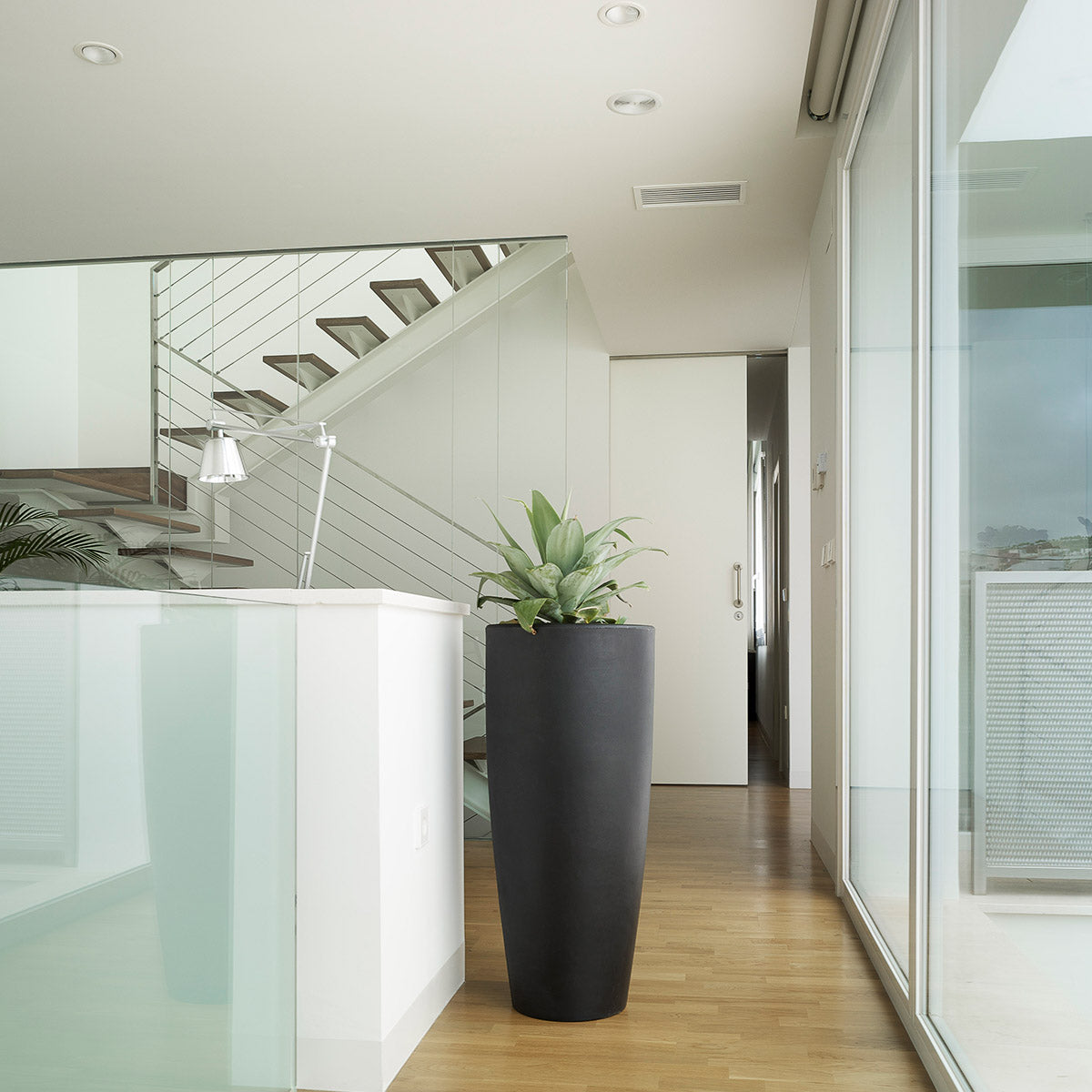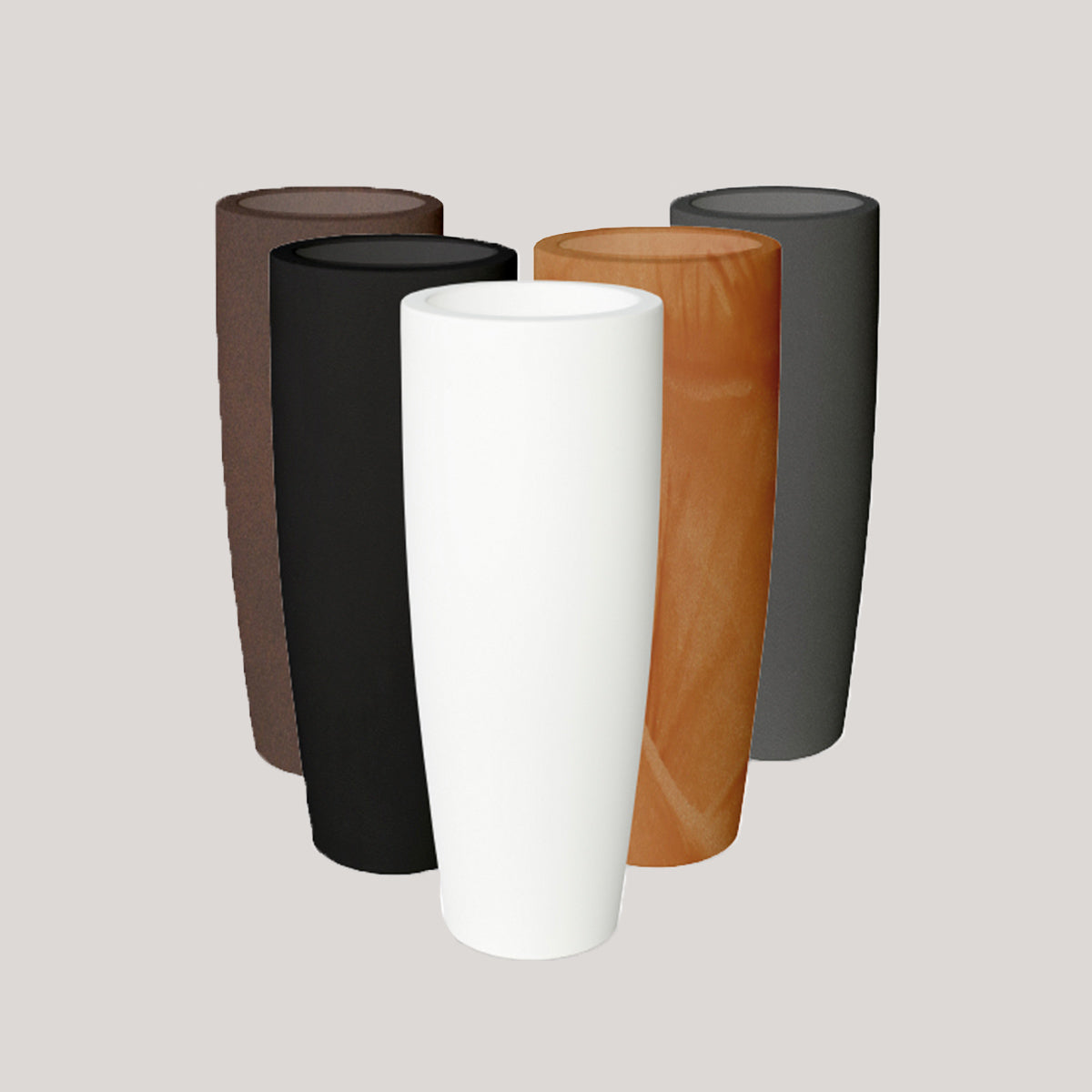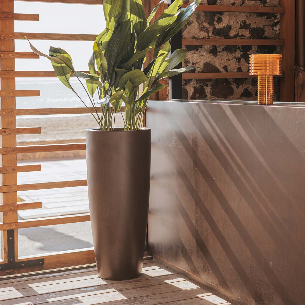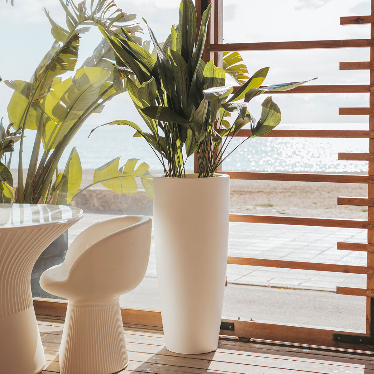 BAMBU: It is a cylindrical planter with a wide planting base. Its height and lightness allow you to have a large flower pot with unparalleled performance. Available in various sizes and finishes, both in color and light.