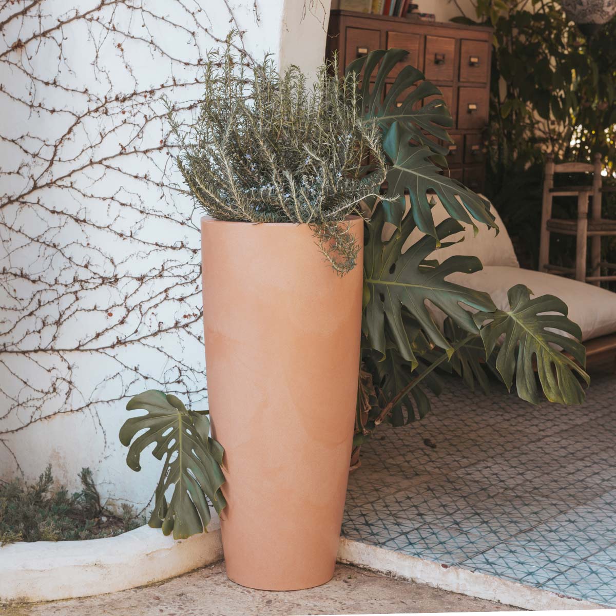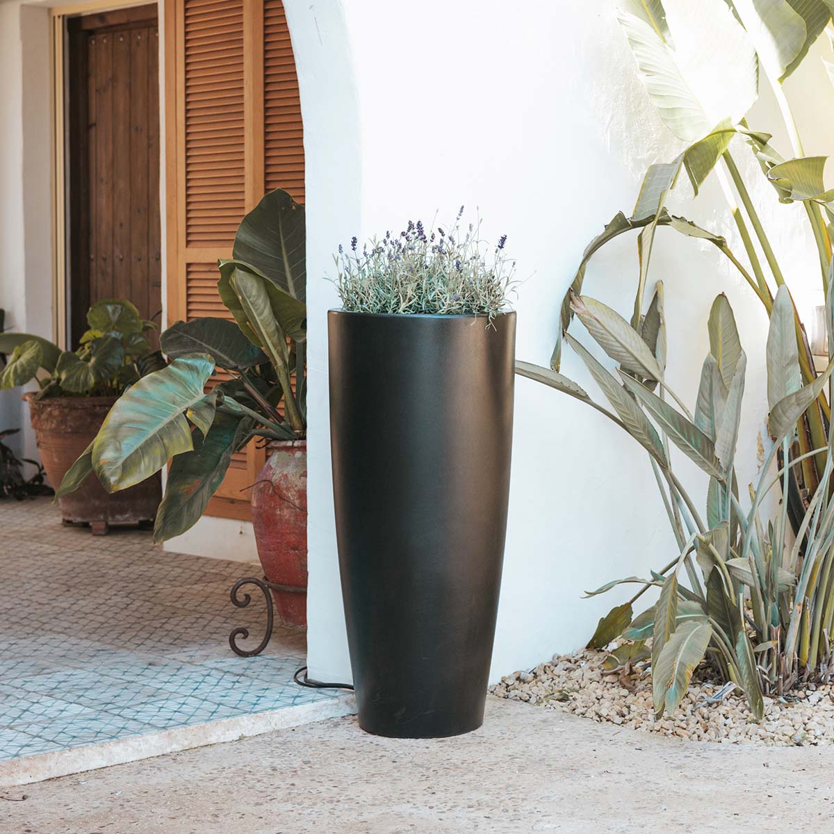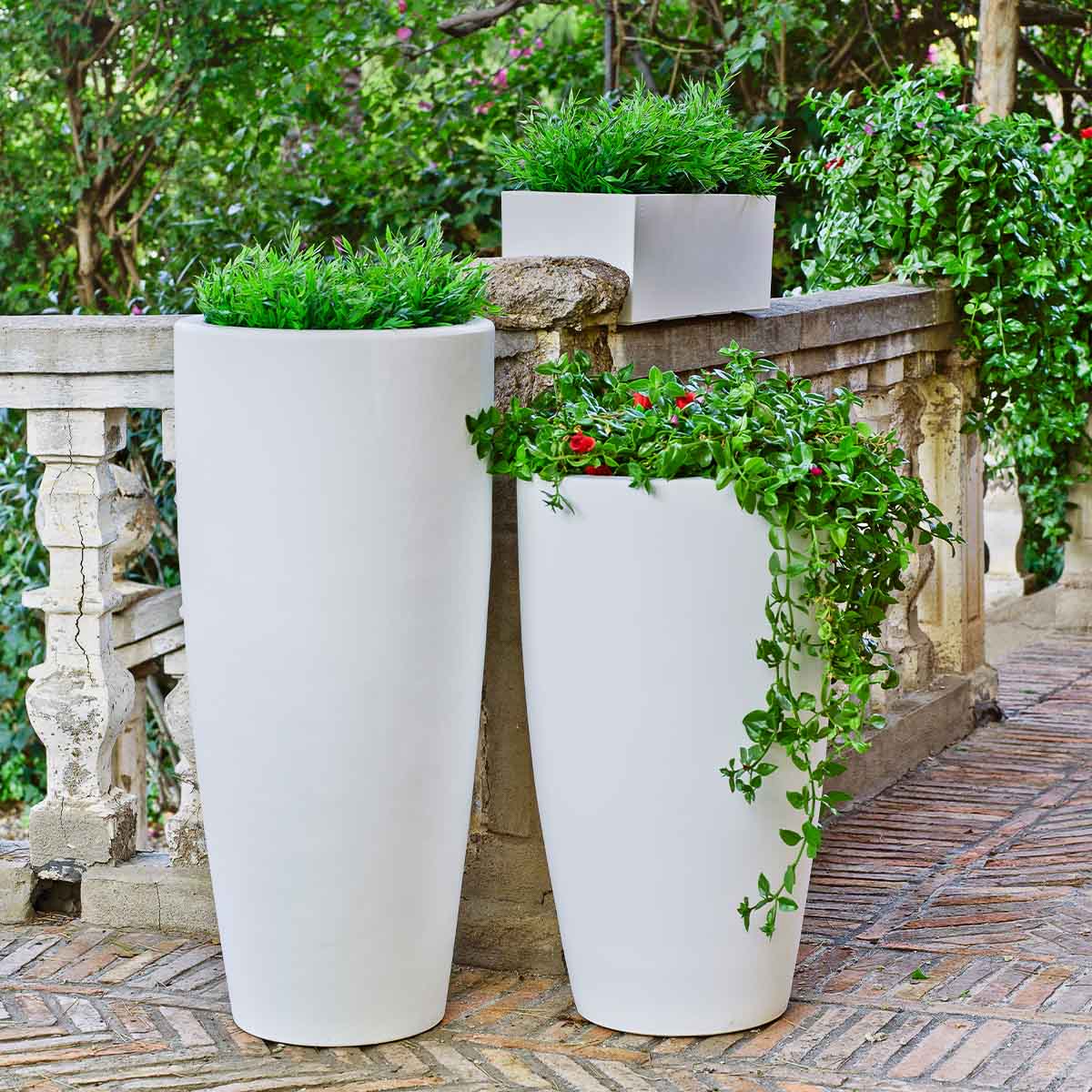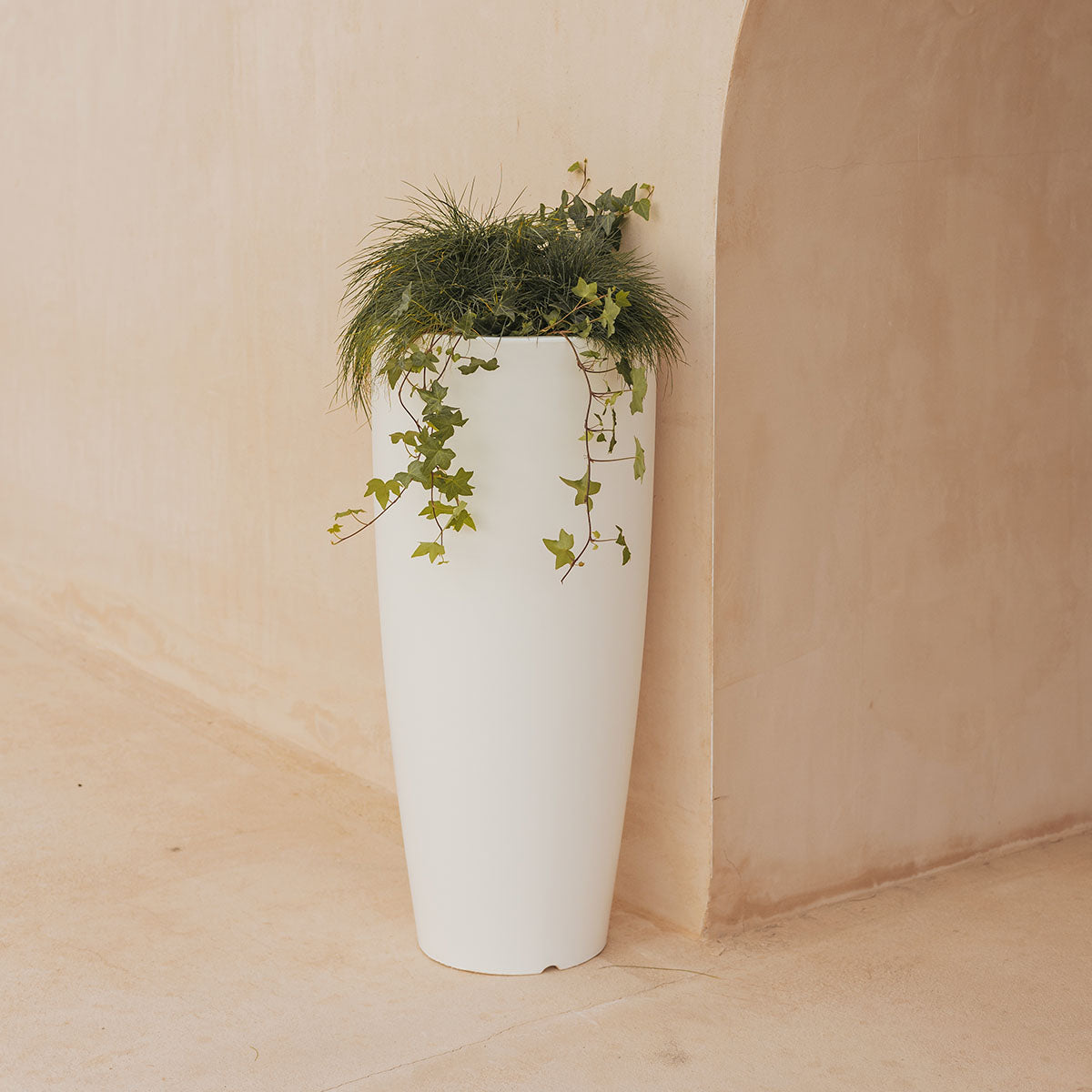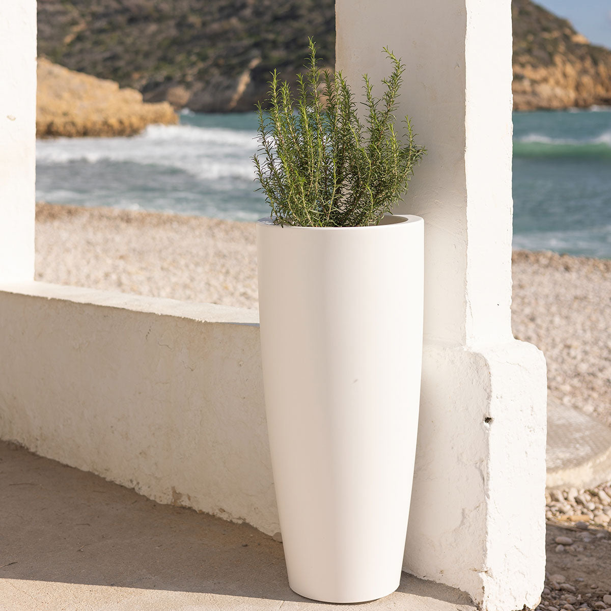 BAMBU: It is a cylindrical planter with a wide planting base. Its height and lightness allow you to have a large flower pot with unparalleled performance. Available in various sizes and finishes, both in color and light.
