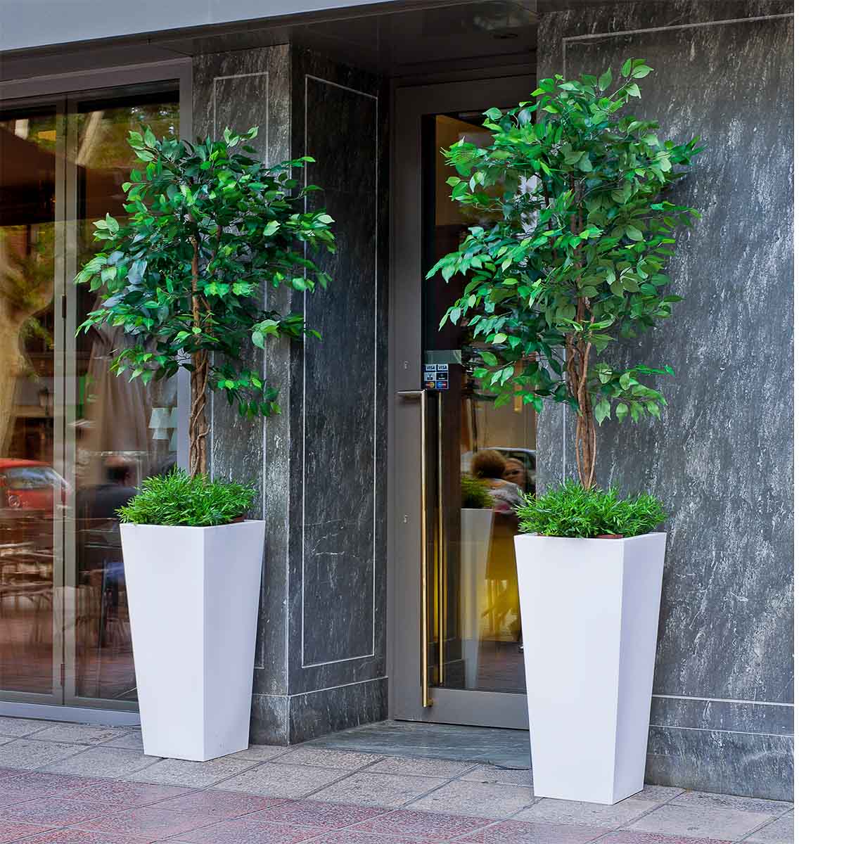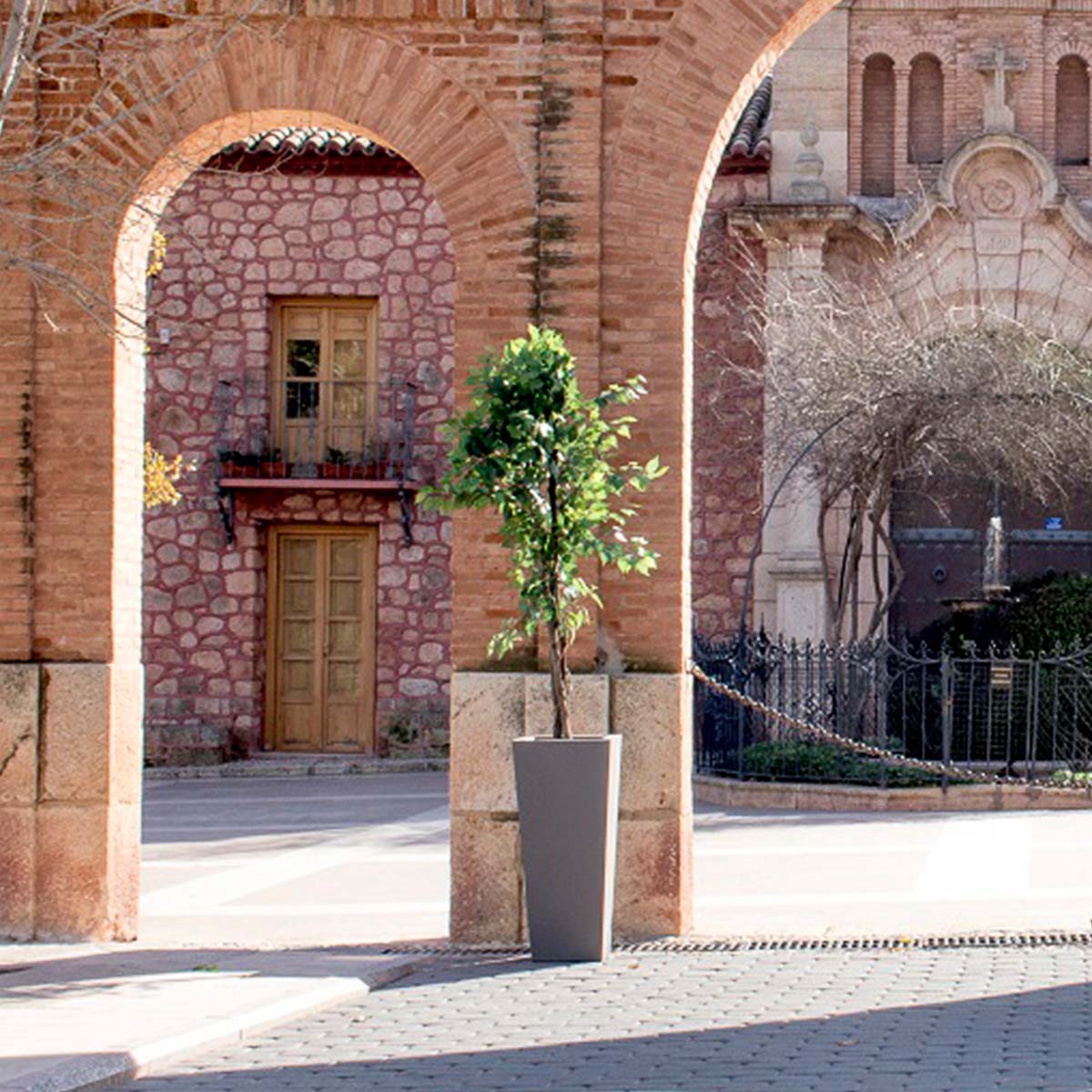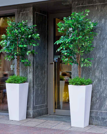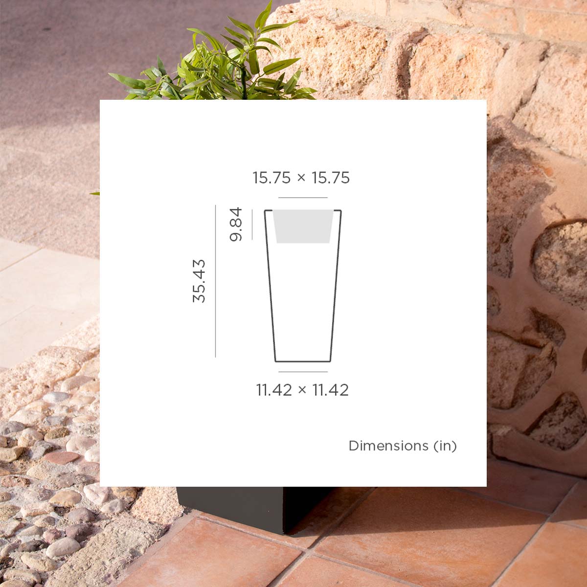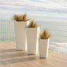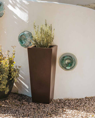MELISA 40 (15.75 × 15.75 × 35.43 in): It is a trapezoidal planter manufactured in various sizes, finishes and colors. Basic lines and texture in a smooth finish.