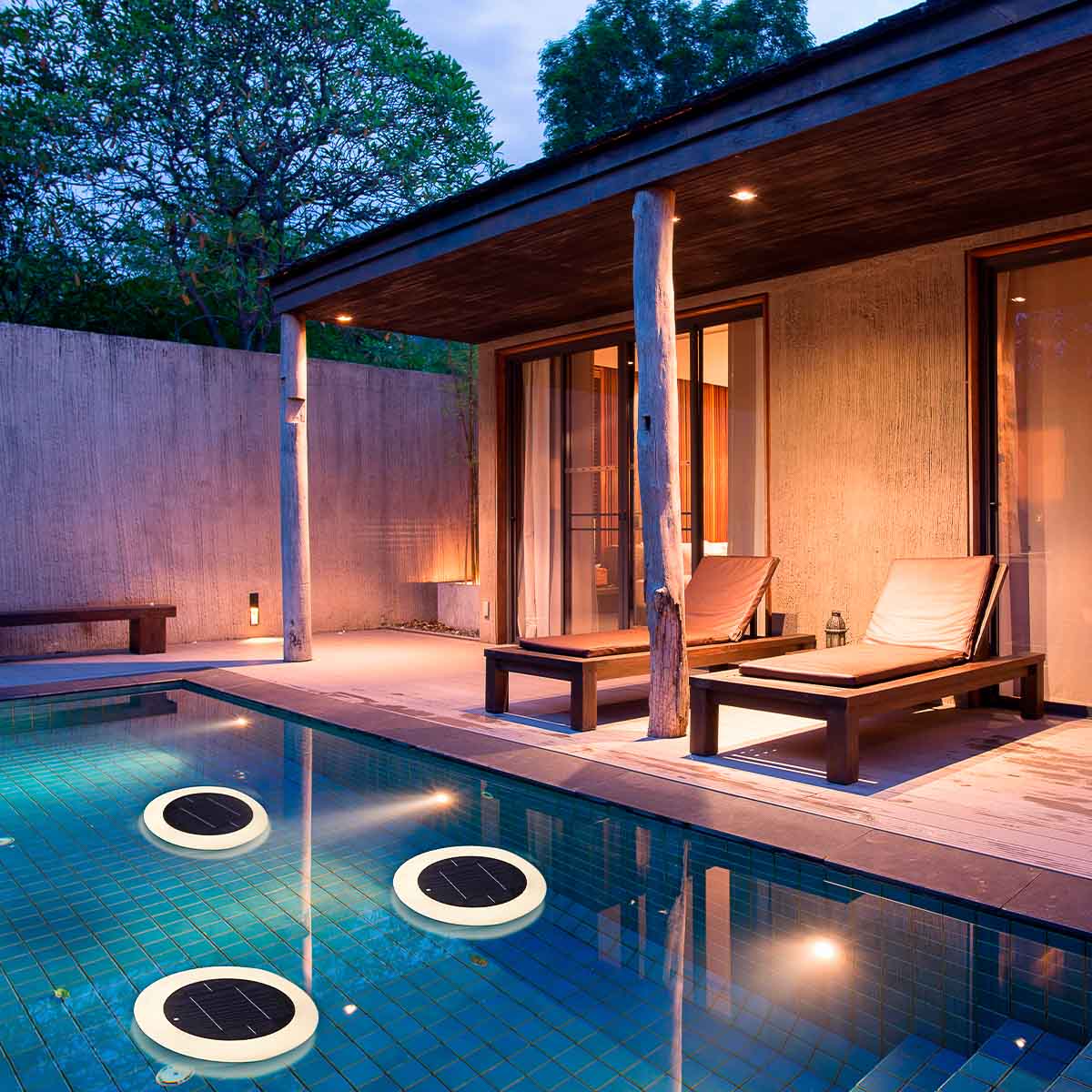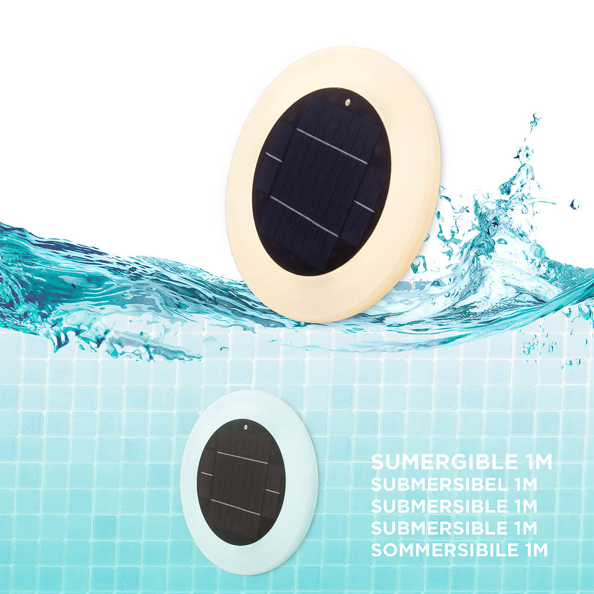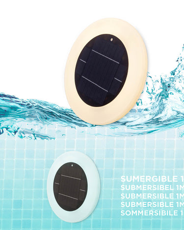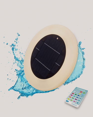 Papaya 30 SOLAR & BATTERY is a wireless light specially designed to illuminate your pool. Its compact and waterproof design means it can be submerged up to 1 meter (IP68). It has a large solar panel integrated so that it can be charged efficiently without the need for cables. It has a remote control with which you can control the light and choose between an endless number of colors, as well as different changing color modes and the possibility of activating the twilight sensor so that it turns on automatically at dusk.