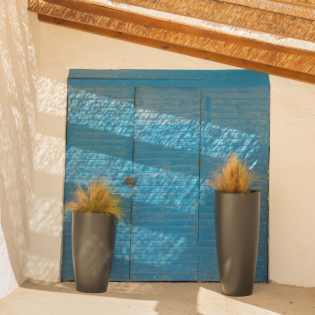 The Bambu Tall Round Outdoor Planter is a vertical cylindrical plant container designed to add height and structure to patios, entryways, pool areas, and commercial spaces. Its tall profile makes it ideal for creating visual framing and architectural planting arrangements.