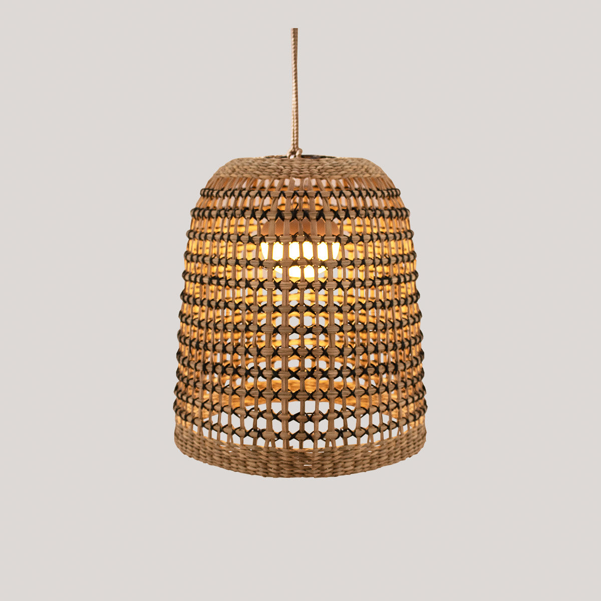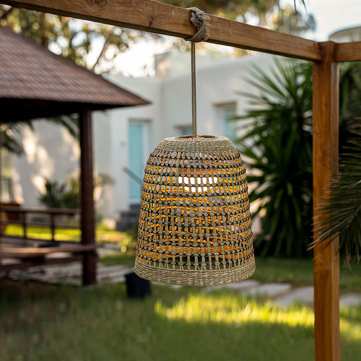 The Positano wireless outdoor pendant lamp is a handcrafted natural fiber hanging light designed to bring warmth and texture to patios, terraces, pergolas, and indoor spaces. It features a 900-lumen rechargeable LED bulb with remote control, requires no installation, and is suitable for both indoor and outdoor use with an IP54 protection rating.